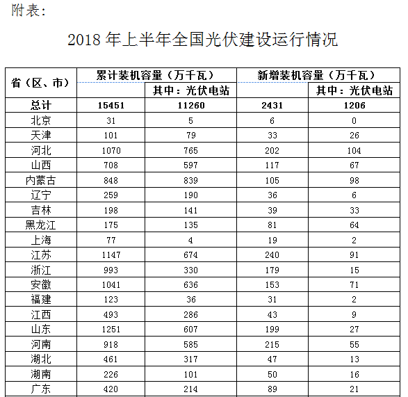 截至2018年6月底,全國(guó)光伏發(fā)電裝機(jī)容量達(dá)到15451萬千瓦,其中,光伏電站11260萬千瓦,分布式光伏4190.3萬千瓦。上半年光伏發(fā)電量823.9億千瓦時(shí),同比增長(zhǎng)59%;棄光率3.6%,同比下降3.2個(gè)百分點(diǎn)。棄光主要集中在新疆和甘肅,其中,新疆(不含兵團(tuán))棄光電量13.5億千瓦時(shí),棄光率20%,同比下降6.1個(gè)百分點(diǎn);甘肅棄光電量5.9億千瓦時(shí),棄光率11%,同比下降11個(gè)百分點(diǎn)。