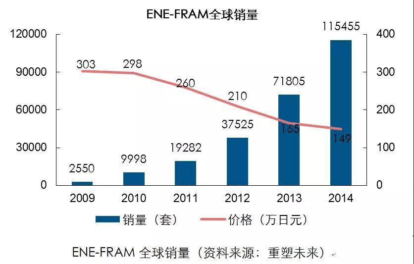 在銷量方面,2014年ENE-FARM全球銷量11萬套,售價149萬日元(大約8.7萬人民幣)。2017年5月,ENE-FARM全球銷量突破20萬套。對此,日本政府提出在2030年之前實現(xiàn)約相當于日本一成家庭的530萬套的銷售目標。