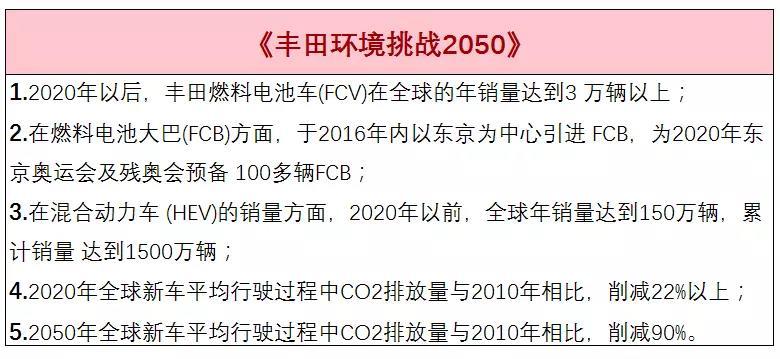 2015年10月15日豐田汽車對外公布《豐田環(huán)境挑戰(zhàn)2050》。豐田計劃,于2020年以后,豐田燃料電池車(FCV)在全球的年銷量達到3 萬輛以上;在燃料電池大巴(FCB)方面,于2016年內(nèi)以東京為中心引進 FCB,為2020年東京奧運會及殘奧會預(yù)備 100多輛FCB;此外,2050年全球新車平均行駛過程中CO2排放量與2010年相比,削減90%。