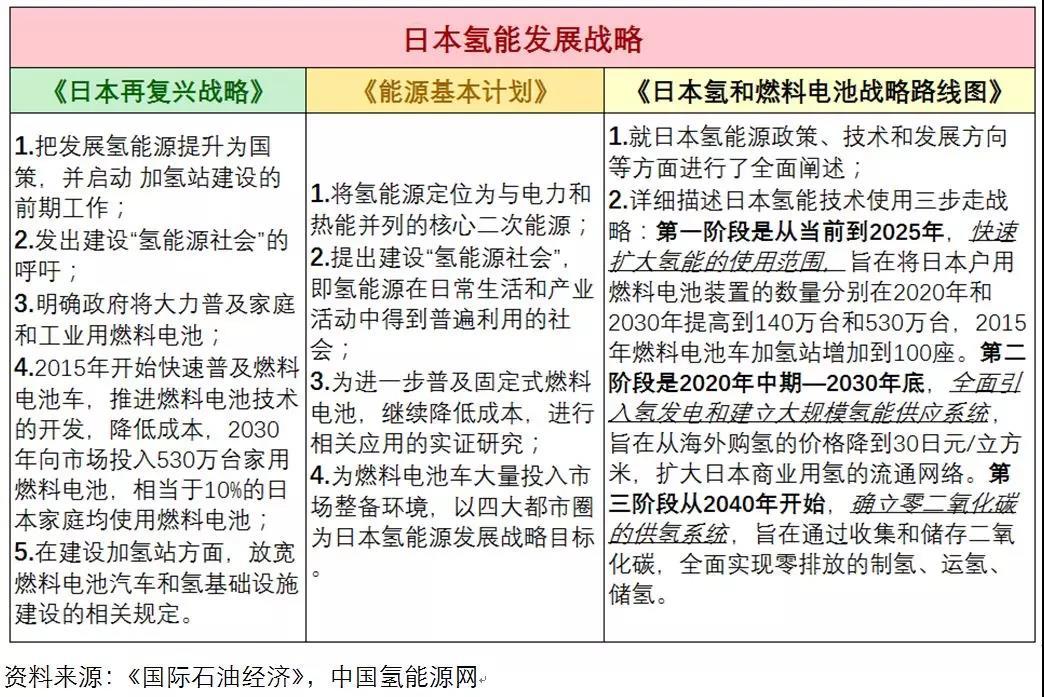 日本主要的國家戰(zhàn)略有《日本再復(fù)興戰(zhàn)略》、《能源基本計劃》和《氫能/燃料電池戰(zhàn)略發(fā)展路線圖》。