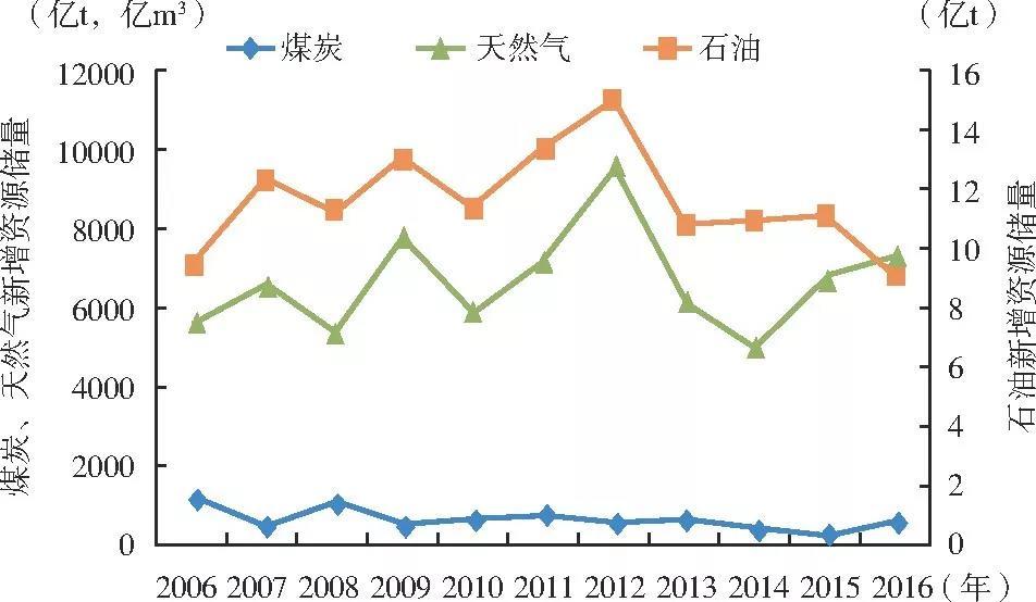 圖7 2006—2016年我國(guó)主要化石能源新增資源儲(chǔ)量