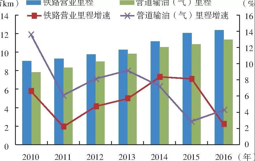 鐵路運(yùn)輸、油氣管網(wǎng)也在不斷完善。截止到2016年底,我國(guó)鐵路營(yíng)業(yè)里程增加至12.4萬(wàn)km,鐵路密度也提高至129 km/萬(wàn)km2,較2010年提高了36%;油氣長(zhǎng)輸管道總里程累計(jì)約為12.6萬(wàn)km,其中天然氣管道約7.43萬(wàn)km(已扣減退役封存管道),原油管道約2.62萬(wàn)km,成品油管道約2.55萬(wàn)km。
