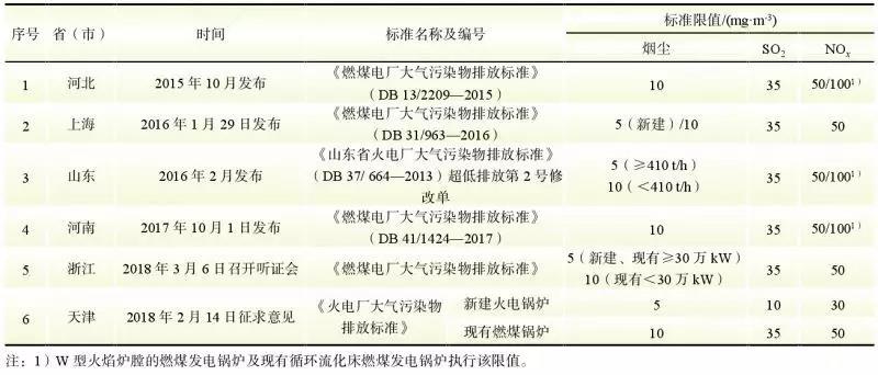 截至目前,已有6個(gè)省級(jí)政府發(fā)布或即將發(fā)布火電廠或燃煤電廠大氣污染物強(qiáng)制性地方標(biāo)準(zhǔn),將超低排放要求標(biāo)準(zhǔn)化,它們分別是河南、河北、上海、山東、浙江、天津,其中天津市2018年2月發(fā)布《火電廠大氣污染物排放標(biāo)準(zhǔn)》(征求意見稿),浙江省于2018年3月6日召開了《燃煤電廠大氣污染物排放標(biāo)準(zhǔn)》聽證會(huì),其他4個(gè)省份的地方標(biāo)準(zhǔn)均已發(fā)布。上海、山東、浙江對(duì)新建鍋爐或一定規(guī)模以上鍋爐的煙塵提出了5mg/m3的燃?xì)鈽?biāo)準(zhǔn)限值要求,其他省份提出的標(biāo)準(zhǔn)限值與國家“超低排放”限值基本一致,詳見表2。另外,值得注意的是上海、浙江強(qiáng)制性地方標(biāo)準(zhǔn)中要求燃煤發(fā)電鍋爐應(yīng)采取煙溫控制及其他有效措施消除石膏雨、有色煙雨等現(xiàn)象;浙江省還將排放績效控制要求寫入強(qiáng)制性地方標(biāo)準(zhǔn)中。