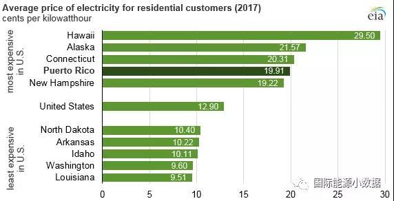 在美國(guó)各州中,夏威夷的居民電價(jià)最高,達(dá)到29.50美分/千瓦時(shí)(約人民幣2.0元/千瓦時(shí));而居民電價(jià)最低的是路易斯安那州,為9.51美分/千瓦時(shí)(約合人民幣0.65元/千瓦時(shí)),與中國(guó)居民電價(jià)差不多。