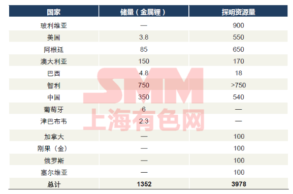 根據(jù)美國地質(zhì)調(diào)查局公布的數(shù)據(jù),世界鋰資源儲量(金屬鋰)總計為1,352萬噸,探明資源量為3,978萬噸。其中世界探明資源量排名前十一位為玻利維亞、智利、阿根廷、美國、中國、澳大利亞、加拿大、剛果(金)、俄羅斯、塞爾維亞和巴西。