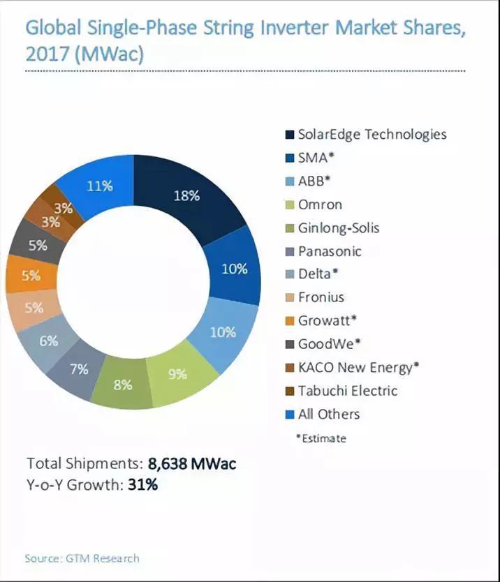 全球單相組串式逆變器榜單中,SolarEdge排名第一,SMA、ABB位居第二、三位,中國(guó)企業(yè)錦浪、臺(tái)達(dá)、古瑞瓦特、固德威均進(jìn)入全球前十。