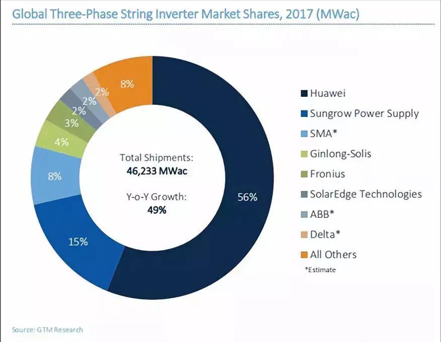 從市場(chǎng)趨勢(shì)來(lái)看,GTM Research報(bào)告顯示,就細(xì)分市場(chǎng)而言,2017年全球三相組串式逆變器出貨量為46.233GW,同比增長(zhǎng)49%。而2017年集中式逆變器出貨量為42.382GW,這是組串式逆變器出貨量首次超過集中式,超出規(guī)模約為4GW。