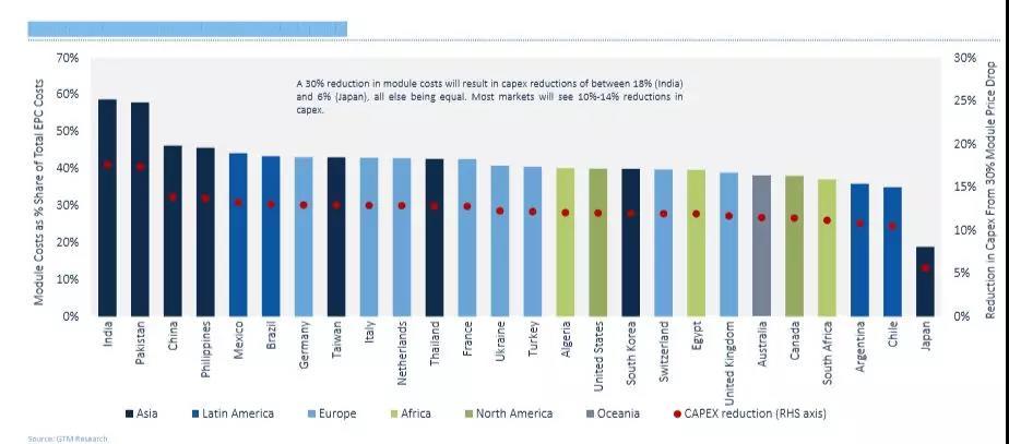 組件價格下降的好處主要體現(xiàn)在亞洲市場,在其他條件相同的情況下,組件成本降低30%將導致大多數(shù)市場的資本支出減少10%-14%。而印度資本支出將減少18%,日本資本支出減少6%,為亞洲最低。