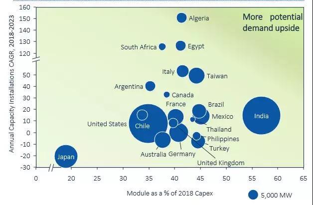 在印度,組件成本占公用事業(yè)規(guī)模太陽能項目成本的57%。組件成本下降約30%將導致總資本支出減少17%以上。此外,印度最近公布了關于延長投標項目的電網(wǎng)并網(wǎng)時間。這意味著將有更多的競爭性關稅被投標,盡管這可能會因組件的潛在進口關稅持續(xù)存在的不確定性而有所緩和。此外,它還可能導致安裝被推遲到2019-2022年。