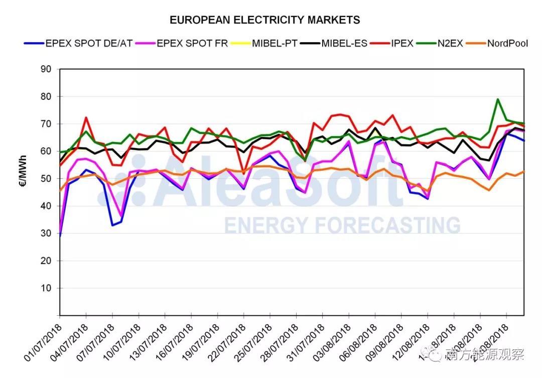 中國(guó)儲(chǔ)能網(wǎng)訊:過(guò)去幾周,歐洲幾個(gè)主要電力批發(fā)市場(chǎng)的電價(jià)一直持續(xù)上漲。以中西歐的德法市場(chǎng)為首,西南歐的MIBEL(西班牙和葡萄牙)市場(chǎng)、英國(guó)市場(chǎng)、意大利市場(chǎng)(IPEX)甚至北歐市場(chǎng)(Nord Pool)皆紛紛中招。