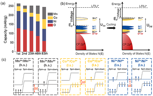 圖3 Li1.2Ni0.15Co0.1Mn0.55O2不同充放電周次的氧化還原反應(yīng)(a)不同元素在不同充放電周次對(duì)容量的貢獻(xiàn);(b)電子結(jié)構(gòu)變化帶來的鋰離子儲(chǔ)存電勢的變化;(c)不同過渡金屬氧化還原電對(duì)能級(jí)差異與電壓衰減關(guān)聯(lián)。