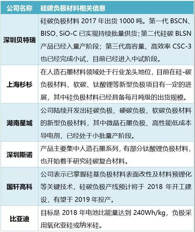 作為新鋰離子電池負極材料,硅碳負極對于提升電池能量密度能發(fā)揮比當前石墨負極更顯著功效。硅碳負極的應用,可以提升電池中活性物質含量,從而大大提升單體電芯的容量。據預測,2020年硅碳負極材料市場空間50億左右,同時市場集中度將非常高。