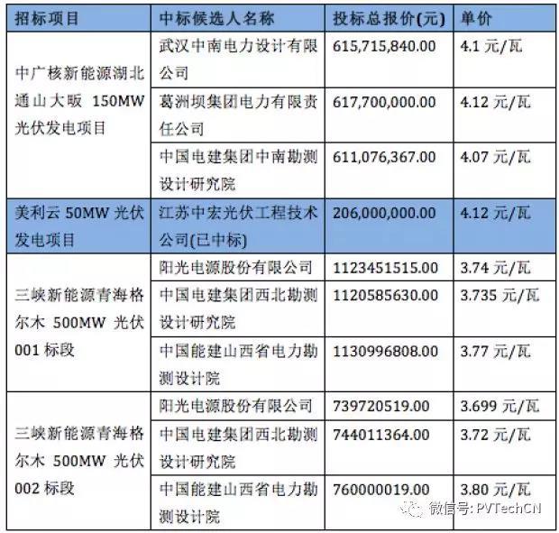 中國儲能網(wǎng)訊:不久前,三峽新能源公示青海省格爾木500MW和陜西渭南100MW光伏發(fā)電應(yīng)用領(lǐng)跑者項(xiàng)目EPC總承包中標(biāo)候選人,陽光電源分別以約為3.745元/瓦、3.699元/瓦、4.847元/瓦的單瓦報價位列兩個招標(biāo)共三個標(biāo)段的第一候選人。
