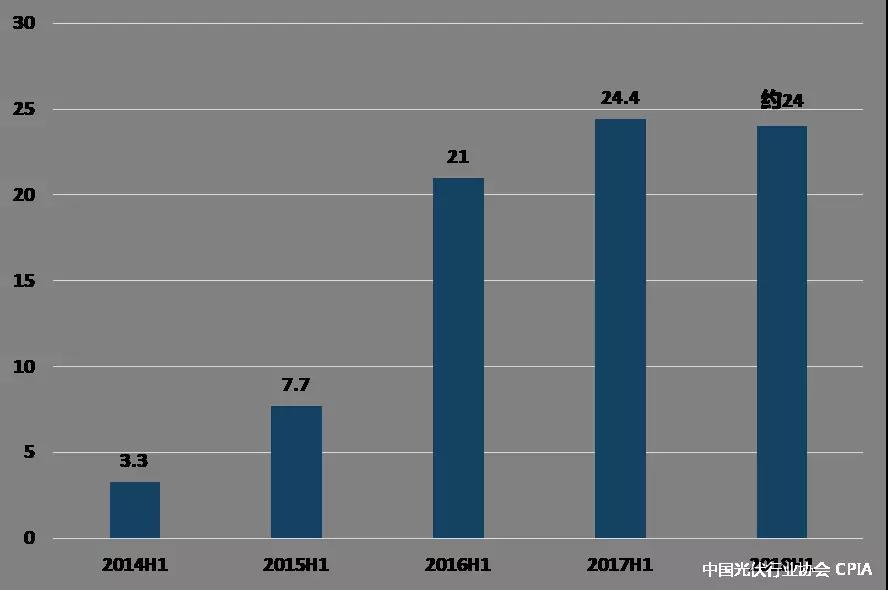 據(jù)中國光伏行業(yè)協(xié)會統(tǒng)計,2018年1-6月,我國多晶硅產(chǎn)量14.3萬噸,同比增加24%以上;硅片產(chǎn)量50GW,同比增長38.9%;電池片產(chǎn)量39GW,同比增長21.9%;組件產(chǎn)量42GW,同比增長23.5%。在產(chǎn)多晶硅企業(yè)在1-5月均滿產(chǎn)甚至超產(chǎn)運行,6月企業(yè)庫存增加,部分企業(yè)通過安排檢修方式減產(chǎn),產(chǎn)量有所下滑。組件環(huán)節(jié)產(chǎn)量中,仍有50%以上在國內(nèi)市場消化,行業(yè)平均產(chǎn)能利用率在76.5%左右。