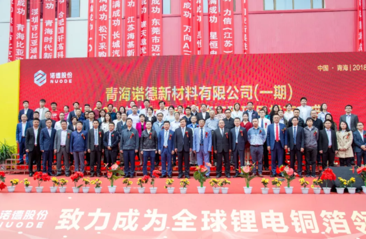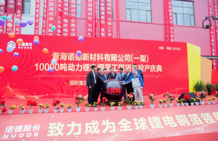 8月30日上午,諾德投資股份有限公司(以下簡稱諾德股份)旗下全資子公司青海諾德新材料有限公司(以下簡稱青海諾德)(一期)10000噸動力鋰電銅箔工程項目投產(chǎn)慶典在青海諾德一期廠房北側(cè)盛大舉辦。