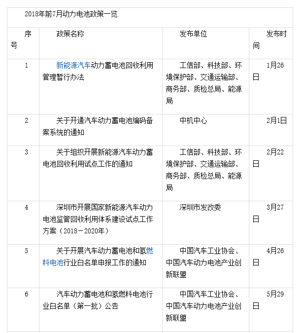 經(jīng)電動(dòng)汽車資源網(wǎng)統(tǒng)計(jì),2018年前7月,國(guó)家及地方共發(fā)布動(dòng)力電池方面的政策或標(biāo)準(zhǔn)10條,其中7條直接與動(dòng)力電池回收利用有關(guān),2條和動(dòng)力電池白名單有關(guān),1條和新建動(dòng)力電池企業(yè)投資項(xiàng)目有關(guān)。