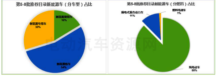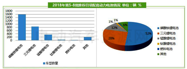 磷酸鐵鋰電池在推薦目錄配套中占據(jù)半壁江山,主要是因?yàn)槟壳靶履茉纯蛙囍饕钶d磷酸鐵鋰電池,而新能源客車在第5-8批推薦目錄中占比54%。