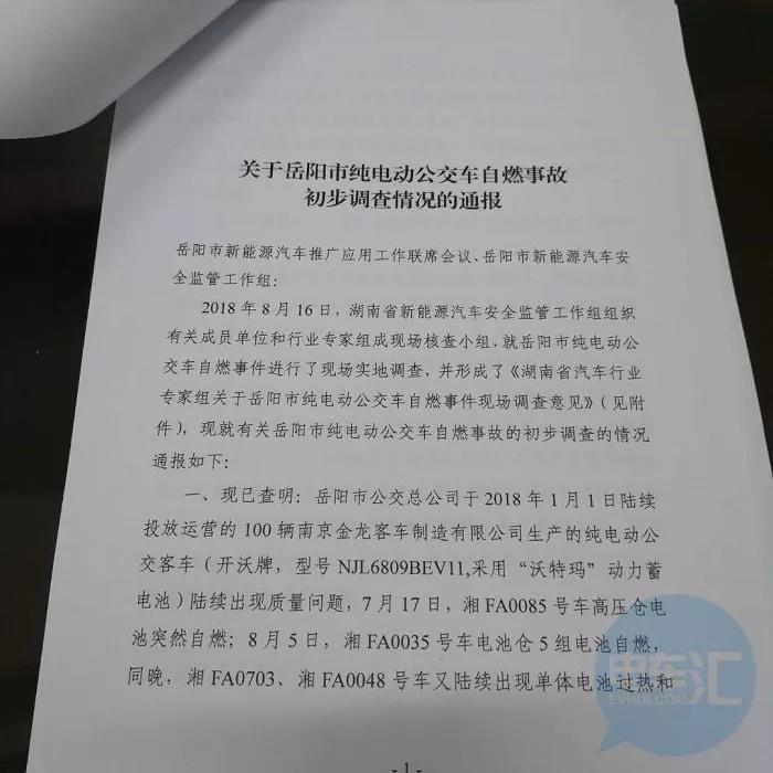 中國(guó)儲(chǔ)能網(wǎng)訊:日前,針對(duì)投放運(yùn)營(yíng)的純電動(dòng)公交車(chē)自燃事故,湖南省岳陽(yáng)市相關(guān)主管部門(mén)工作組發(fā)布了事故認(rèn)定通報(bào)。通報(bào)中明確表示,岳陽(yáng)市公交總公司于2018年1月1日陸續(xù)投放運(yùn)營(yíng)的100輛南方的 客車(chē)制造有限公司生產(chǎn)的純電動(dòng)公交客車(chē)(客車(chē)牌,型號(hào)NJL6809BEV11,采用“沃特瑪”動(dòng)力蓄電池)陸續(xù)出現(xiàn)質(zhì)量問(wèn)題。