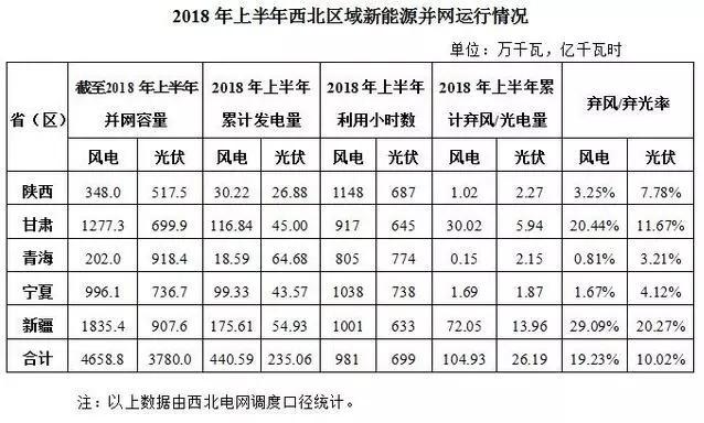 數(shù)據(jù)顯示,上半年西北五省(區(qū))新增風(fēng)電并網(wǎng)容量100萬千瓦,累計(jì)并網(wǎng)容量4658.8萬千瓦,占全網(wǎng)總裝機(jī)的19.02%。風(fēng)電發(fā)電量440.59億千瓦時(shí),占全網(wǎng)總發(fā)電量的11.87%;平均利用小時(shí)數(shù)981小時(shí),棄風(fēng)電量104.93億千瓦時(shí),棄風(fēng)率19.23%。西北五省(區(qū))棄風(fēng)率依次為:新疆29.09%,甘肅20.44%、陜西3.25%、寧夏1.67%、青海0.81%。