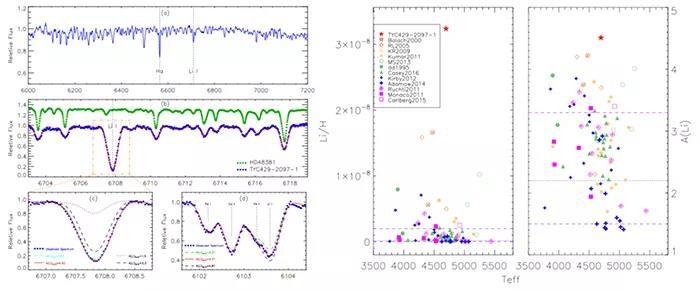 右圖:已知的富鋰巨星中鋰豐度的對比。其中紅色五角星為本工作所發(fā)現(xiàn)的富鋰巨星,兩個縱坐標分別為分別為Li/H和A(Li)。