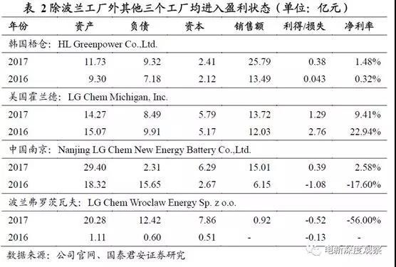 單看LG化學動力電池業(yè)務,盈利情況也不樂觀,韓國梧倉、美國霍蘭德、中國南京、波蘭弗羅茨瓦夫四大工廠2016年、2017年利潤及凈利率偏低,波蘭弗羅茨瓦夫一直處于虧損狀態(tài);四家工廠2017年銷售額共55.44億元,利潤1.54億元,詳細數(shù)據(jù)如下: