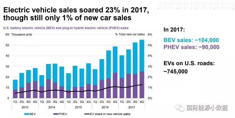 2017年美國共銷售19.4萬輛電動車(包括9萬輛插電混動),比2017年增長13%,但只占同年汽車市場規(guī)模的1%。到2017年底美國電動車存量為74.5萬輛。