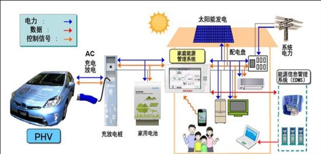 通過插電式混合動(dòng)力車配備的交直流轉(zhuǎn)換器(逆變器),為住宅提供交流電,同時(shí)還可在車輛、充電樁和住宅之間進(jìn)行數(shù)據(jù)通信,利用家庭能源管理系統(tǒng)(HEMS)對電流進(jìn)行優(yōu)化控制??衫媒ㄖ暗貐^(qū)的光伏發(fā)電設(shè)備所發(fā)的電力及電費(fèi)較低的深夜電力為車輛充電,在用電高峰時(shí)段將儲(chǔ)存的電力移峰用于住宅。