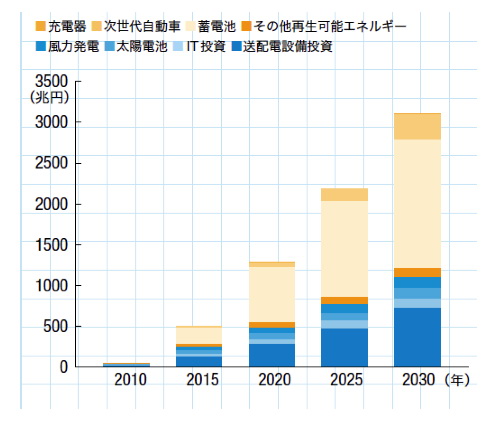 電動車產(chǎn)業(yè)(次世代自動車)雖然消耗電池的數(shù)量甚高,但是在基礎(chǔ)建設尚未成熟且周邊延伸產(chǎn)業(yè)尚未成形之際,于近五年內(nèi)仍舊難以大規(guī)模普及;反觀儲能電池(蓄電池)產(chǎn)業(yè)除可搭配著再生能源做應用,也可單獨使用作為緊急備用電力系統(tǒng),未來的市場需求可期。根據(jù)日本METI預估(圖一),全球儲能系統(tǒng)需求將隨著智能城市的興起而成長,以日本市場而言,因為災害所促成的城鎮(zhèn)再造機會,將更加速落實新型態(tài)能源應用的進程,預估將在2012年開始在日本市場會有明顯的成長需求,未來五年更會快速擴展至全球各主要城鎮(zhèn)地區(qū)。