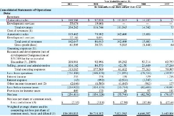 Tesla的汽車銷量營收從2007年時的7.3萬美元上升到了2011年的1.485億美元。