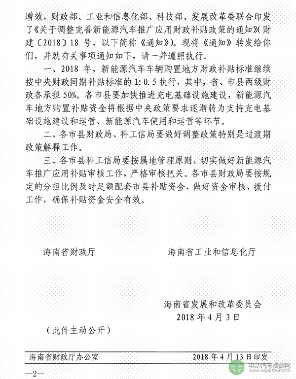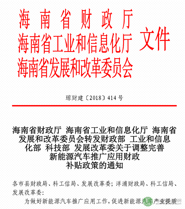 中國儲能網(wǎng)訊:海南省轉(zhuǎn)發(fā)四部委發(fā)布的《關(guān)于調(diào)整完善新能源汽車推廣應用財政補貼政策的通知》,對海南省新能源汽車地補做出規(guī)定和解釋。2018年,新能源汽車車輛購置地方財政補貼標準繼續(xù)按中央財政同期補貼標準的1:0.5執(zhí)行,其中,省、市縣兩級財政各承擔50%。各市縣要加快推進充電基礎(chǔ)設(shè)施建設(shè),新能源汽車地方購置補貼資金將根據(jù)中央政策要求逐漸轉(zhuǎn)為支持充電基礎(chǔ)設(shè)施建設(shè)和運營、新能源汽車使用和運營等環(huán)節(jié)。