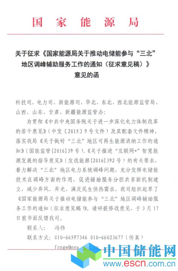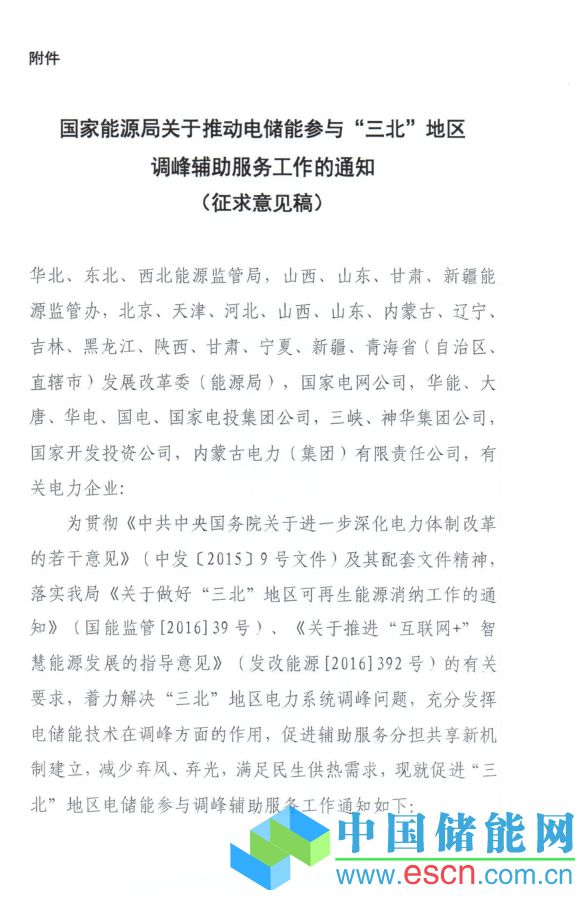 中國(guó)儲(chǔ)能網(wǎng)訊:為貫徹《中共中央國(guó)務(wù)院關(guān)于進(jìn)一步深化電力體制改革的若干意見(jiàn)》(中發(fā)〔2015〕9號(hào)文件)及其配套文件精神,落實(shí)國(guó)家能源局《關(guān)于做好“三北”地區(qū)可再生能源消納工作的通知》(國(guó)能監(jiān)管〔2016〕39號(hào))、《關(guān)于推進(jìn)“互聯(lián)網(wǎng)+”智慧能源發(fā)展的指導(dǎo)意見(jiàn)》(發(fā)改能源〔2016〕392號(hào))的有關(guān)要求,著力解決“三北”地區(qū)電力系統(tǒng)調(diào)峰問(wèn)題,充分發(fā)揮電儲(chǔ)能技術(shù)在調(diào)峰方面的作用,促進(jìn)輔助服務(wù)分擔(dān)共享新機(jī)制建立,減少棄風(fēng)、棄光,滿足民生供熱需求,能源局市場(chǎng)監(jiān)管司起草了《國(guó)家能源局關(guān)于推動(dòng)電儲(chǔ)能參與“三北”地區(qū)調(diào)峰輔助服務(wù)工作的通知(征求意見(jiàn)稿)》。具體內(nèi)容如下: