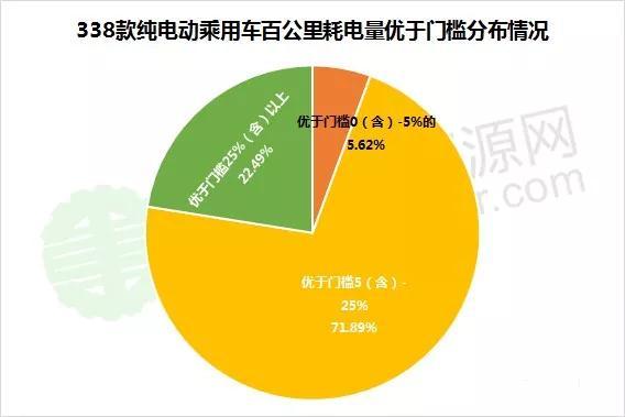 此外,2018年新能源汽車補(bǔ)貼政策表示,按整車整備質(zhì)量(m)不同,工況條件下百公里耗電量(Y)應(yīng)滿足以下門檻條件:m≤1000kg時,Y≤0.0126×m+0.45;1000<m≤1600kg時, Y≤0.0108×m+2.25;m>1600kg時,Y≤0.0045×m+12.33。百公里耗電量(Y)優(yōu)于門檻0(含)-5%的車型按0.5倍補(bǔ)貼,優(yōu)于門檻5(含)-25%的車型按1倍補(bǔ)貼,優(yōu)于門檻25%(含)以上的車型按1.1倍補(bǔ)貼。經(jīng)電動汽車資源網(wǎng)測算,有兩款車型百公里耗電量跨越兩個區(qū)間,其余368款車型中優(yōu)于門檻0(含)-5%的車型有19款,占比5.62%;優(yōu)于門檻5(含)-25%的車型有243款,占比71.89%;優(yōu)于門檻25%(含)以上的車型有76款,占比22.49%。