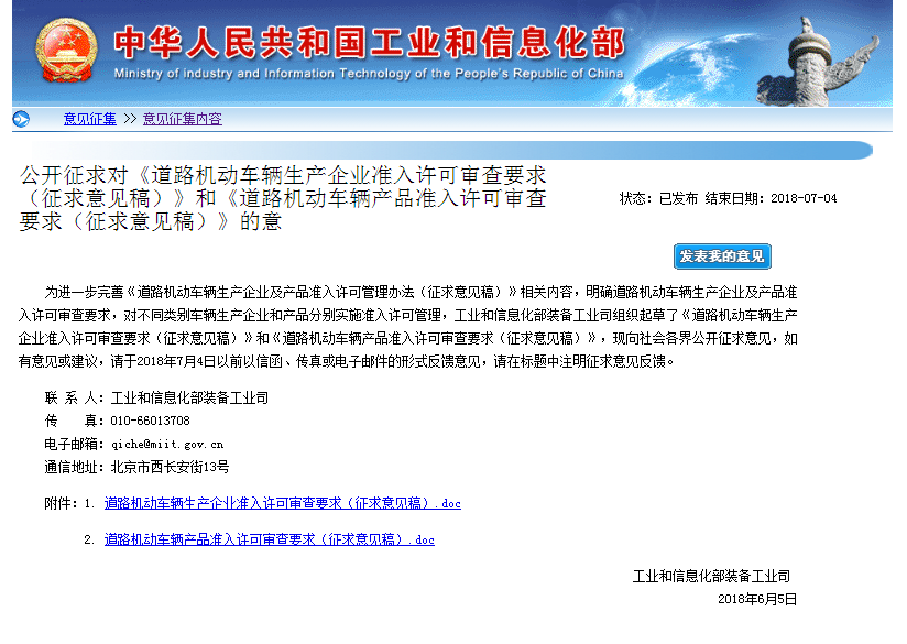 為進(jìn)一步完善《道路機(jī)動車輛生產(chǎn)企業(yè)及產(chǎn)品準(zhǔn)入許可管理辦法(征求意見稿)》相關(guān)內(nèi)容,明確道路機(jī)動車輛生產(chǎn)企業(yè)及產(chǎn)品準(zhǔn)入許可審查要求,對不同類別車輛生產(chǎn)企業(yè)和產(chǎn)品分別實施準(zhǔn)入許可管理,工業(yè)和信息化部裝備工業(yè)司組織起草了《道路機(jī)動車輛生產(chǎn)企業(yè)準(zhǔn)入許可審查要求(征求意見稿)》和《道路機(jī)動車輛產(chǎn)品準(zhǔn)入許可審查要求(征求意見稿)》,現(xiàn)向社會各界公開征求意見,如有意見或建議,請于2018年7月4日以前以信函、傳真或電子郵件的形式反饋意見,請在標(biāo)題中注明征求意見反饋。