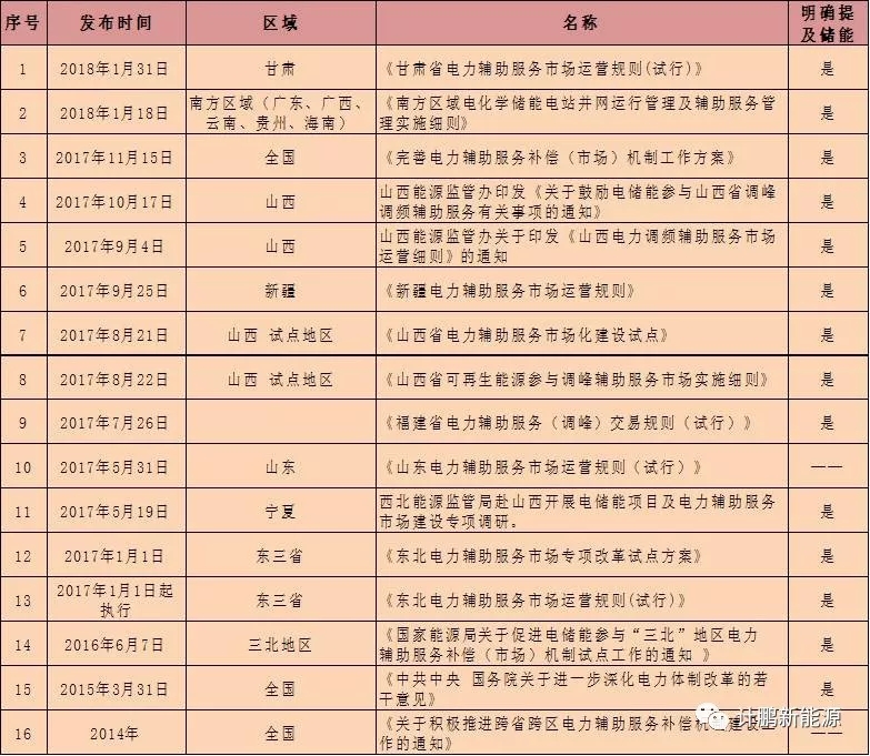 2017年至2018年2月集中出臺(tái)了13項(xiàng)政策,2018年會(huì)有更多的省份陸續(xù)出臺(tái)有關(guān)電力輔助服務(wù)或電儲(chǔ)能參與電力輔助服務(wù)交易的專項(xiàng)政策。南網(wǎng)、新疆、山西、東北、山西等地的政策中均有專門針對(duì)儲(chǔ)能參與輔助服務(wù)或者單獨(dú)的章節(jié)。