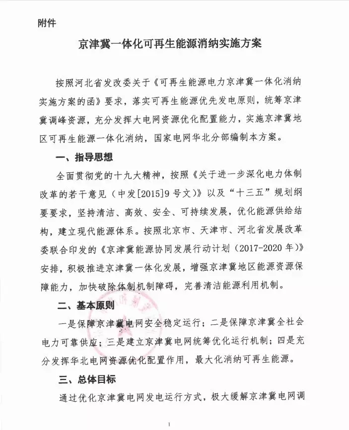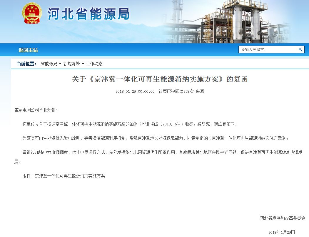 為貫徹落實《京津冀協(xié)同發(fā)展規(guī)劃綱要》,在2017年11月15日的采暖季開始之前,北京、天津和河北三地發(fā)改委就聯(lián)合印發(fā)了《京津冀能源協(xié)同發(fā)展行動計劃(2017-2020年)》(以下簡稱行動計劃)。行動計劃提出,未來將推進可再生能源發(fā)展,大力發(fā)展風電、光電,推進風電基地建設(shè)。打造張家口可再生能源示范區(qū),建設(shè)崇禮低碳奧運專區(qū)。規(guī)劃建設(shè)能源高端應(yīng)用示范區(qū),鼓勵多能互補、智能融合的能源利用新模式。此外,還將促進可再生能源消納,優(yōu)先安排張家口可再生能源示范區(qū)等可再生能源和清潔能源上網(wǎng),實現(xiàn)在京津冀區(qū)域一體化消納。
