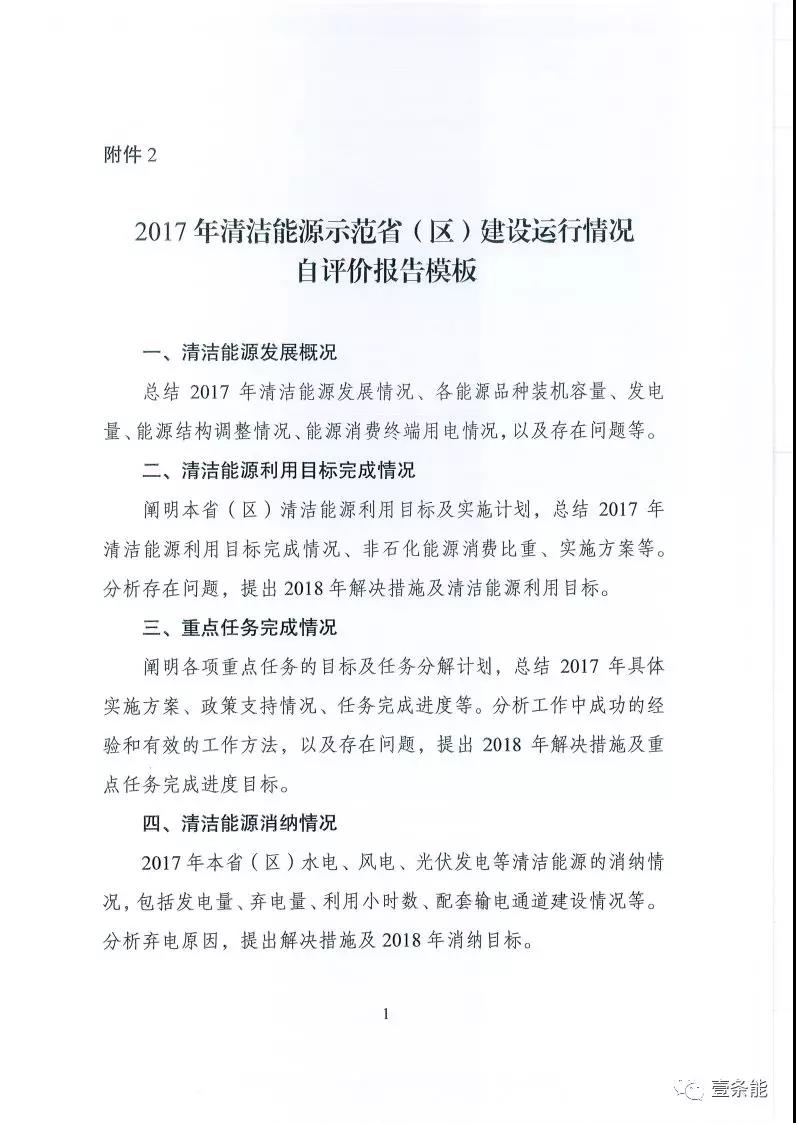 四、開展2017年清潔能源示范?。▍^(qū))評價(jià)工作。各有關(guān)?。▍^(qū))能源主管部門在2018年3月1日前提交2017年建設(shè)運(yùn)行情況自評價(jià)報(bào)告。2017年清潔能源示范?。▍^(qū))建設(shè)運(yùn)行情況自評價(jià)報(bào)告模板見附件2。