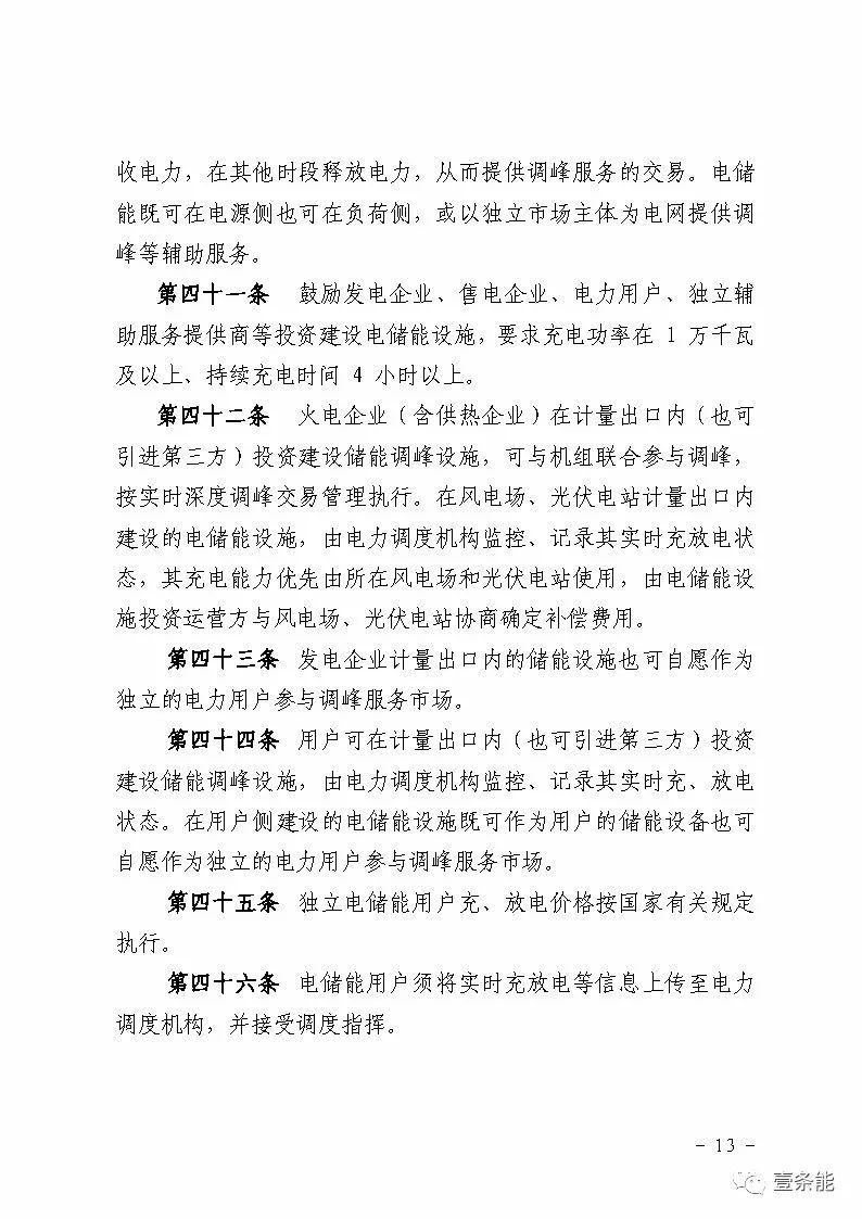 火電企業(yè)在計(jì)量出口內(nèi)投資建設(shè)儲(chǔ)能調(diào)峰設(shè)施,可與機(jī)組聯(lián)合參與調(diào)峰,按實(shí)時(shí)深度調(diào)峰交易管理執(zhí)行。在風(fēng)電場(chǎng)、光伏電站計(jì)量出口內(nèi)建設(shè)的電儲(chǔ)能設(shè)施,由電力調(diào)度機(jī)構(gòu)監(jiān)控、記錄其實(shí)時(shí)充放電狀態(tài),其充電能力優(yōu)先由所在風(fēng)電場(chǎng)和光伏電站使用,由電儲(chǔ)能設(shè)施投資運(yùn)營(yíng)方與風(fēng)電場(chǎng)、光伏電站協(xié)商確定補(bǔ)償費(fèi)用。