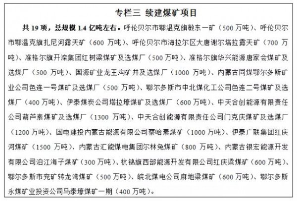 穩(wěn)步推進(jìn)煤炭生產(chǎn)基地建設(shè)。統(tǒng)籌安排煤炭總量和布局,依托勝利、五間房、白音華、準(zhǔn)格爾、東勝、上海廟、伊敏、寶日希勒等大型整裝煤田,按照國(guó)家總體能源戰(zhàn)略部署,重點(diǎn)圍繞保障煤電、現(xiàn)代煤化工等主要耗煤項(xiàng)目用煤需求,推動(dòng)鄂爾多斯、錫林郭勒、呼倫貝爾三大煤炭生產(chǎn)基地建設(shè),力爭(zhēng)到2020年原煤產(chǎn)量控制在11.5億噸左右?!笆濉逼陂g,建成投產(chǎn)煤礦項(xiàng)目35項(xiàng),總規(guī)模2.5億噸左右。續(xù)建煤礦項(xiàng)目19項(xiàng),總規(guī)模1.4億噸左右,其中鄂爾多斯1.2億噸、呼倫貝爾2000萬(wàn)噸左右。圍繞煤電和煤化工基地配套用煤項(xiàng)目,擬新開(kāi)工并建成煤礦項(xiàng)目16項(xiàng),總規(guī)模1.2億噸左右,其中鄂爾多斯新增產(chǎn)能6500萬(wàn)噸、錫林郭勒新增產(chǎn)能4500萬(wàn)噸、通遼新增產(chǎn)能600萬(wàn)噸左右。