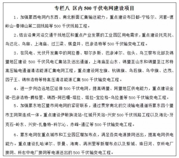 加快新能源外送基地建設(shè)。優(yōu)化配電網(wǎng)、匯集站規(guī)劃和建設(shè),加強(qiáng)風(fēng)能、太陽(yáng)能等新能源匯集能力和效率,著力打造阿拉善(烏海、巴彥淖爾)、包頭北(巴彥淖爾)、鄂爾多斯(巴彥淖爾、烏海、阿拉善)、烏蘭察布(呼和浩特)、錫林郭勒、赤峰、通遼、呼倫貝爾(興安)等8個(gè)新能源基地。重點(diǎn)依托錫盟-山東、錫盟-江蘇、上海廟-山東、蒙西-天津南、扎魯特-山東青州等電力外送通道,加快推進(jìn)通道配套外送新能源項(xiàng)目建設(shè),積極推動(dòng)赤峰、蒙西(烏蘭察布、包頭、阿拉善等)清潔能源外送基地開(kāi)展前期工作?!笆濉逼陂g,力爭(zhēng)新增新能源外送裝機(jī)2300萬(wàn)千瓦左右,其中風(fēng)電1800萬(wàn)千瓦,太陽(yáng)能發(fā)電500萬(wàn)千瓦左右。