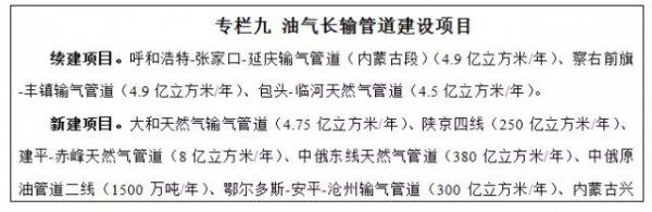 統(tǒng)籌考慮自治區(qū)石油天然氣資源以及煤制燃料項(xiàng)目建設(shè)情況,進(jìn)一步完善油氣管網(wǎng),提高油氣供應(yīng)保障能力?!笆濉逼陂g,建成陜京四線、中俄東線、建平-赤峰、呼和浩特-張家口-延慶輸氣管道(內(nèi)蒙古段)、包頭-臨河、大路-和林格爾、察右前旗-豐鎮(zhèn)輸氣管道和中俄原油管道二線等項(xiàng)目。根據(jù)市場(chǎng)發(fā)展及油氣源項(xiàng)目建設(shè)情況,適時(shí)推進(jìn)訥河-阿榮旗、張家口至錫林浩特、烏蘭察布-二連浩特、烏蘭察布-桑根達(dá)來(lái)-錫林浩特、桑根達(dá)來(lái)-克什克騰旗、中俄西線、杭錦旗-銀川天然氣管道、呼倫貝爾-齊齊哈爾-哈爾濱煤制氣、西氣東輸五線輸氣管道和蒙西、蒙東煤制油外輸管道等項(xiàng)目的前期工作?!笆濉逼陂g,力爭(zhēng)新增輸油能力1500萬(wàn)噸、輸氣能力657億立方米左右。加大油氣長(zhǎng)輸管道安全隱患排查和整改力度,持續(xù)開(kāi)展油氣長(zhǎng)輸管道安全大排查、大整治專項(xiàng)行動(dòng)。加強(qiáng)儲(chǔ)氣設(shè)施建設(shè),進(jìn)一步提高天然氣調(diào)峰和應(yīng)急儲(chǔ)氣能力。