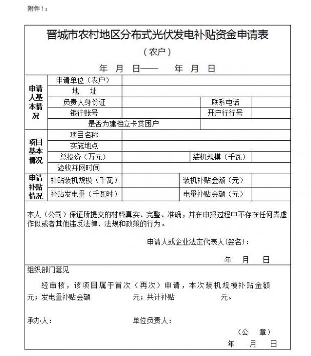 附件1:《晉城市農(nóng)村地區(qū)分布式光伏發(fā)電補貼資金申請表(農(nóng)戶)》(詳見配圖)