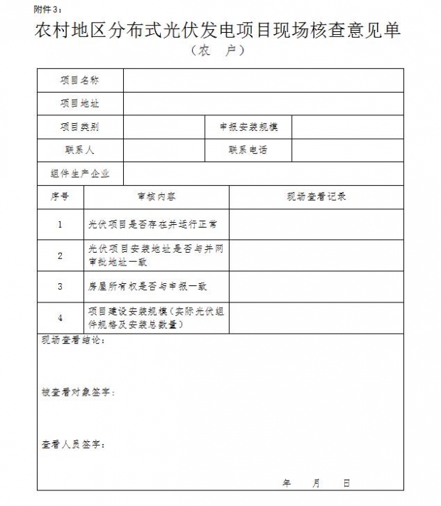 附件3:《農(nóng)村地區(qū)分布式光伏發(fā)電項目現(xiàn)場核查意見單(農(nóng)戶)》(詳見配圖)