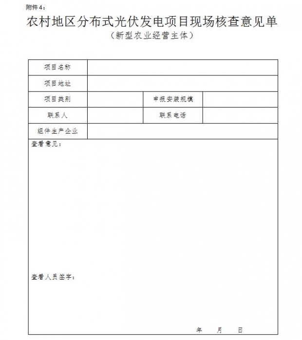 附件4:《農(nóng)村地區(qū)分布式光伏發(fā)電項目現(xiàn)場核查意見單(新型農(nóng)業(yè)經(jīng)營主體)》(詳見配圖)