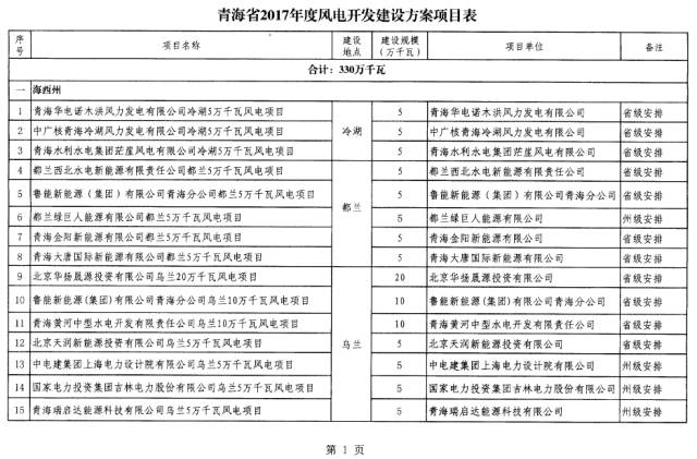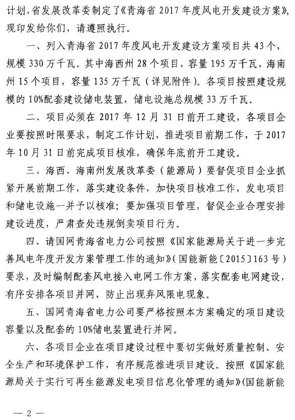 青海此次配置的43個、總計3.3GW的風電項目分別位于海西州(28個、1.95GW)和海南州(15個、1.35GW)。這些項目被要求在2017年10月底前完成核準,年底前開工建設。建成并網時,國網青海電力公司將嚴格要求配套的10%儲電裝置進行并網。