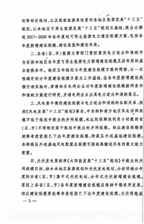 七、有關(guān)省(區(qū)、市)特高壓電力外送通道配套的風(fēng)電、光伏發(fā)電基地,根據(jù)特高壓通道規(guī)劃、批準(zhǔn)時間和建設(shè)周期單獨配置,但應(yīng)計入本省(區(qū)、市)的“十三五”規(guī)劃總規(guī)模,跨越“十三五”、’‘十四五”建設(shè)的特高壓基地,光伏發(fā)電可在2020年安排相應(yīng)建設(shè)規(guī)模,風(fēng)電可在2019年和2020年安排。