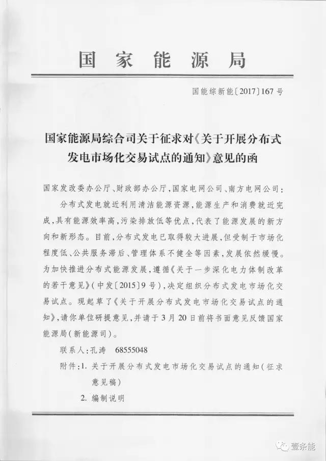 中國(guó)儲(chǔ)能網(wǎng)訊:近日,國(guó)家能源局綜合司近日下發(fā)關(guān)于征求對(duì)《關(guān)于開展分布式發(fā)電市場(chǎng)化交易試點(diǎn)的通知》意見的函。