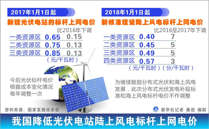 通知規(guī)定,2017年1月1日之后,一類至三類資源區(qū)新建光伏電站的標(biāo)桿上網(wǎng)電價(jià)分別調(diào)整為每千瓦時(shí)0.65元、0.75元、0.85元,比2016年電價(jià)每千瓦時(shí)下調(diào)0.15元、0.13元、0.13元。同時(shí)明確,今后光伏標(biāo)桿電價(jià)根據(jù)成本變化情況每年調(diào)整一次。2018年1月1日之后,一類至四類資源區(qū)新核準(zhǔn)建設(shè)陸上風(fēng)電標(biāo)桿上網(wǎng)電價(jià)分別調(diào)整為每千瓦時(shí)0.40元、0.45元、0.49元、0.57元,比2016-2017年電價(jià)每千瓦時(shí)降低7分、5分、5分、3分。