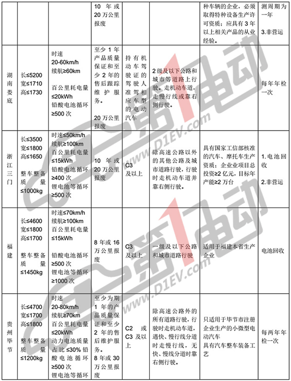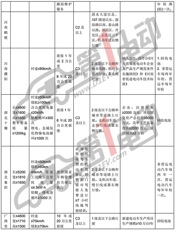 分析總結已出臺的地方管理政策,各地對低速電動車的管理越來越嚴格,全面。對企業(yè)的備案管理中,越來越多的城市提出了制造工藝、投資規(guī)模、產(chǎn)能規(guī)模、資質(zhì)等方面要求。對于產(chǎn)品方面,各地對時速、續(xù)航、尺寸大小的要求不盡相同,縱觀目前市場上主流的低速電動車產(chǎn)品,大多能滿足這些要求。有一定難度的在于百公里能耗及電池循環(huán)次數(shù)。最高如湖北襄陽要求鉛酸電池循環(huán)次數(shù)不低于1000,其他城市大多數(shù)要求循環(huán)次數(shù)不低于500次。年檢、質(zhì)保、報廢期的要求也能規(guī)范產(chǎn)品安全。在駕照方面,絕大多數(shù)城市要求的是C3牌照,山東聊城、河南商丘等少數(shù)城市要求C2牌照。路權方面,“一級及以下公路(城市)道路行駛”的規(guī)定居多,少數(shù)要求二級及以下。