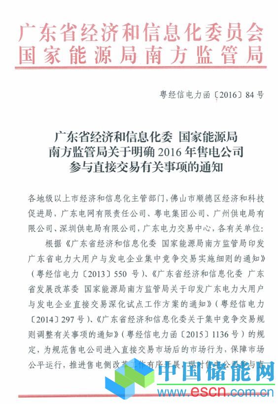 中國(guó)儲(chǔ)能網(wǎng)訊:近日,廣東省經(jīng)濟(jì)和信息化委 國(guó)家能源局南方監(jiān)管局下發(fā)關(guān)于明確2016年售電公司參與直接交易有關(guān)事項(xiàng)的通知,通知全文如下: