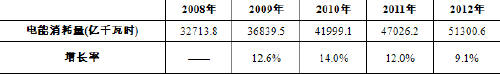 從中國全社會用電需求數(shù)據(jù)來看,近五年以來,中國全社會電力需求規(guī)模持續(xù)快速增長,2012年,中國電能消耗量超過5萬億千瓦時,較2011年增長9.1%。從2008年到2012年,中國電能消耗量年均復合增長率達到11.9%。未來三年,隨著經(jīng)濟發(fā)展、城市建設進程加快,中國電力需求將繼續(xù)保持較高的增長速度,為智能電網(wǎng)的發(fā)展提供有效的市場保證。